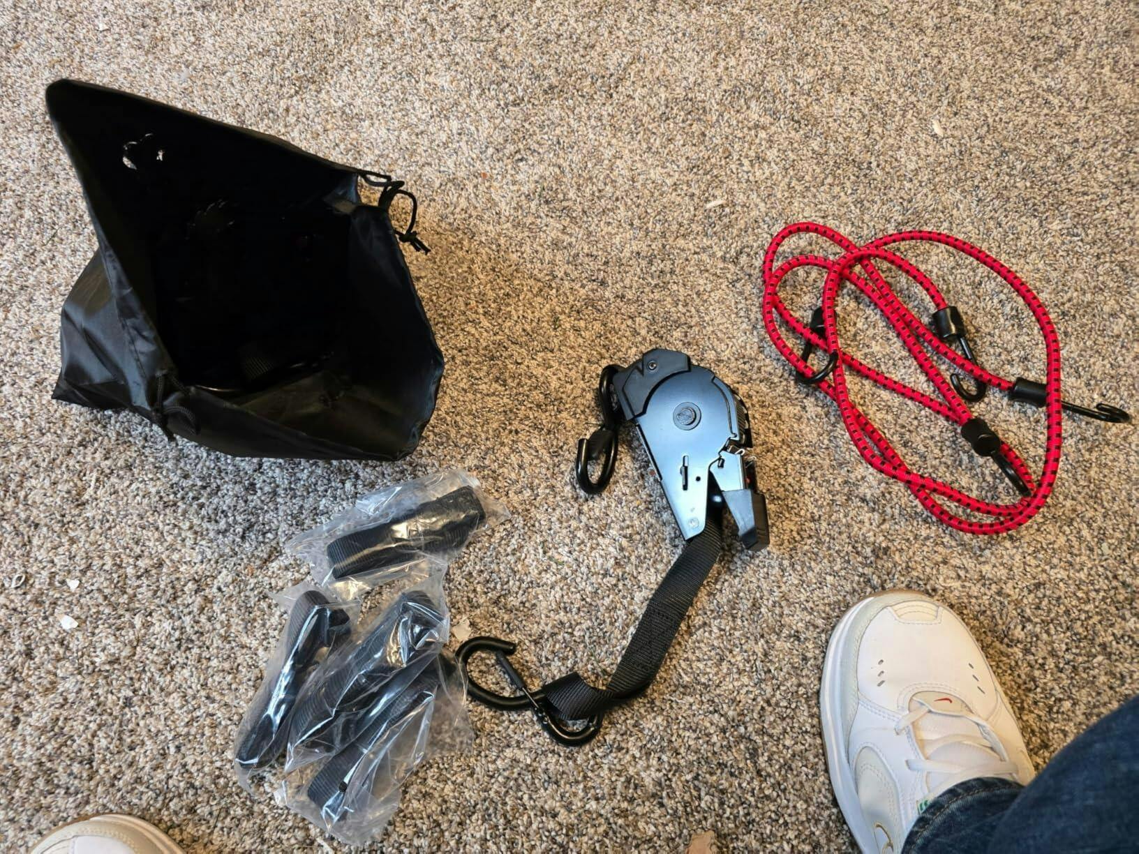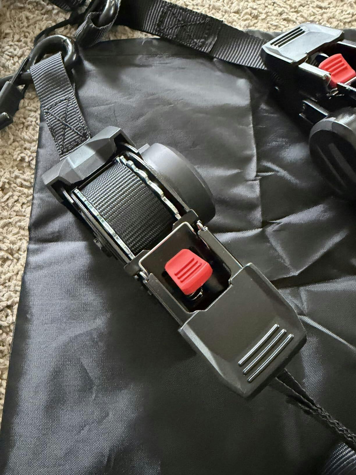 First off, I am used to the old-style ratchet straps that require putting the strap through the ratchet and cranking. Usually, putting the strap in backwards. Having ones that are already wrapped and use a spring-loaded pull does come in very handy and works great for hooking up. I was very pleased with the ease of use and how fast they attached. They also came with bungee cords, tie-down straps, and a bag that everything fits into.