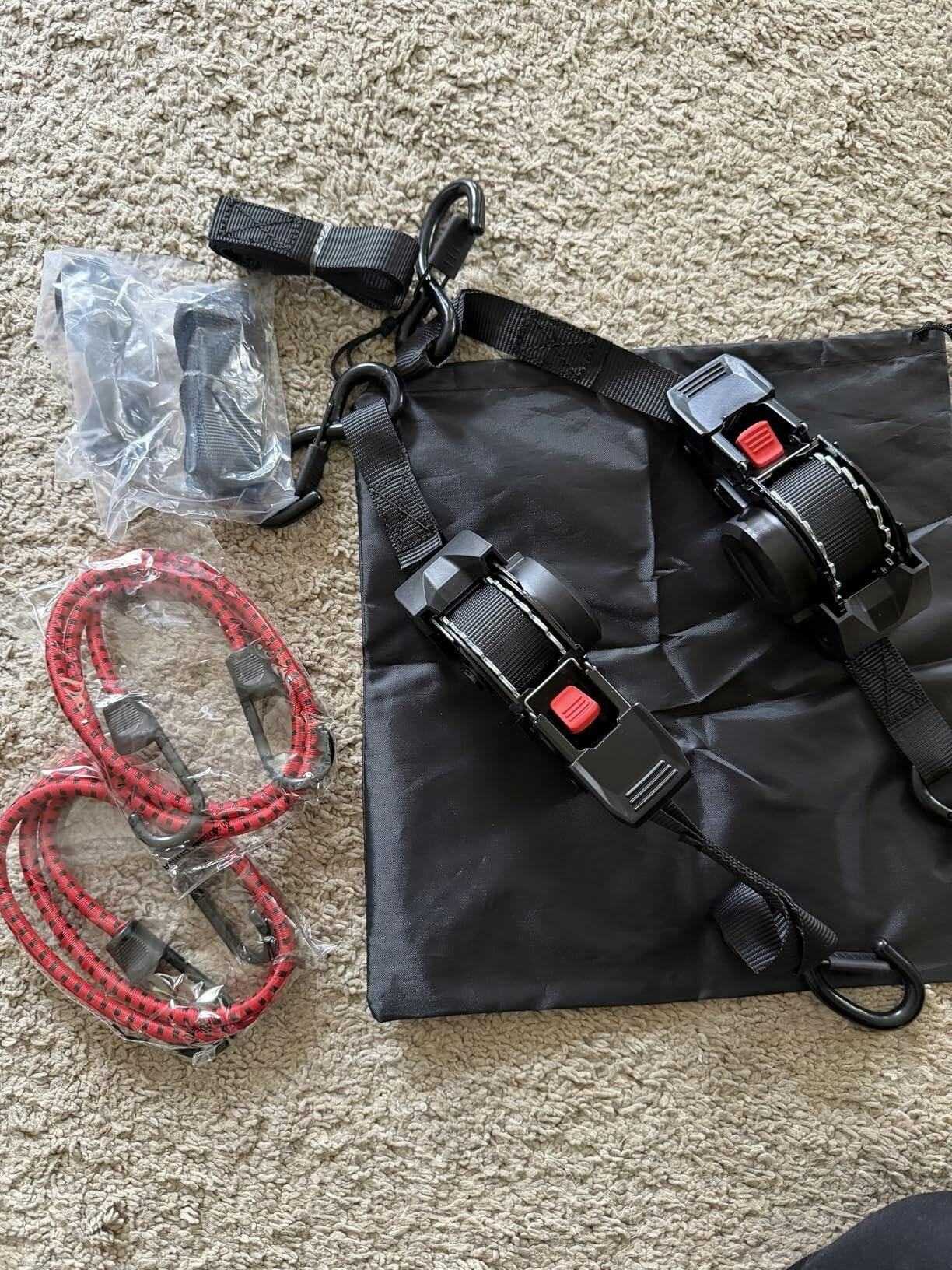 no more dealing with tangled straps. They feel very sturdy and secure, with a high break strength that gives peace of mind when hauling. I also love that the set includes soft loops and bungee cords, making it versatile for motorcycles, kayaks, and more. Highly recommend for anyone needing dependable tie-downs!