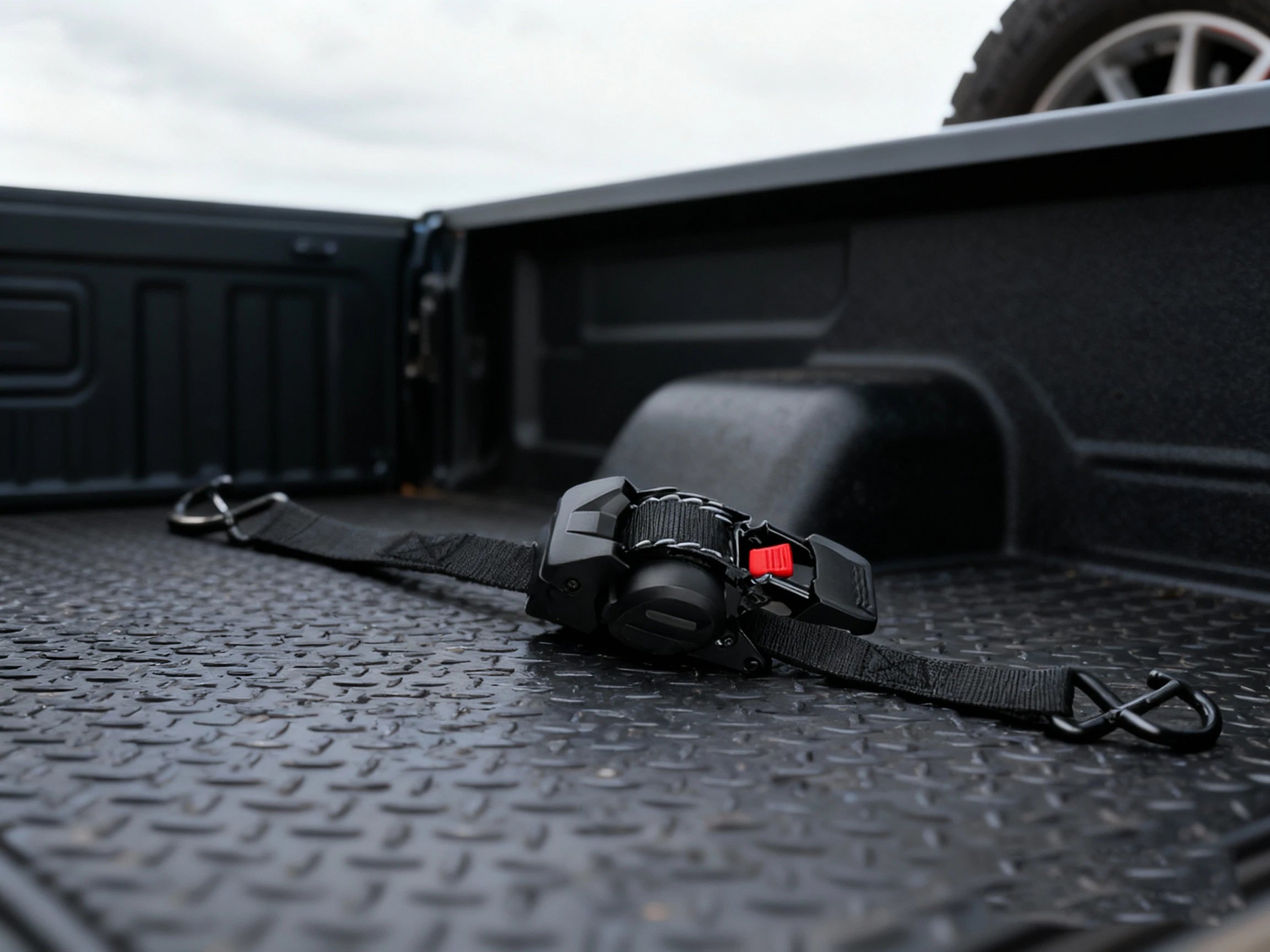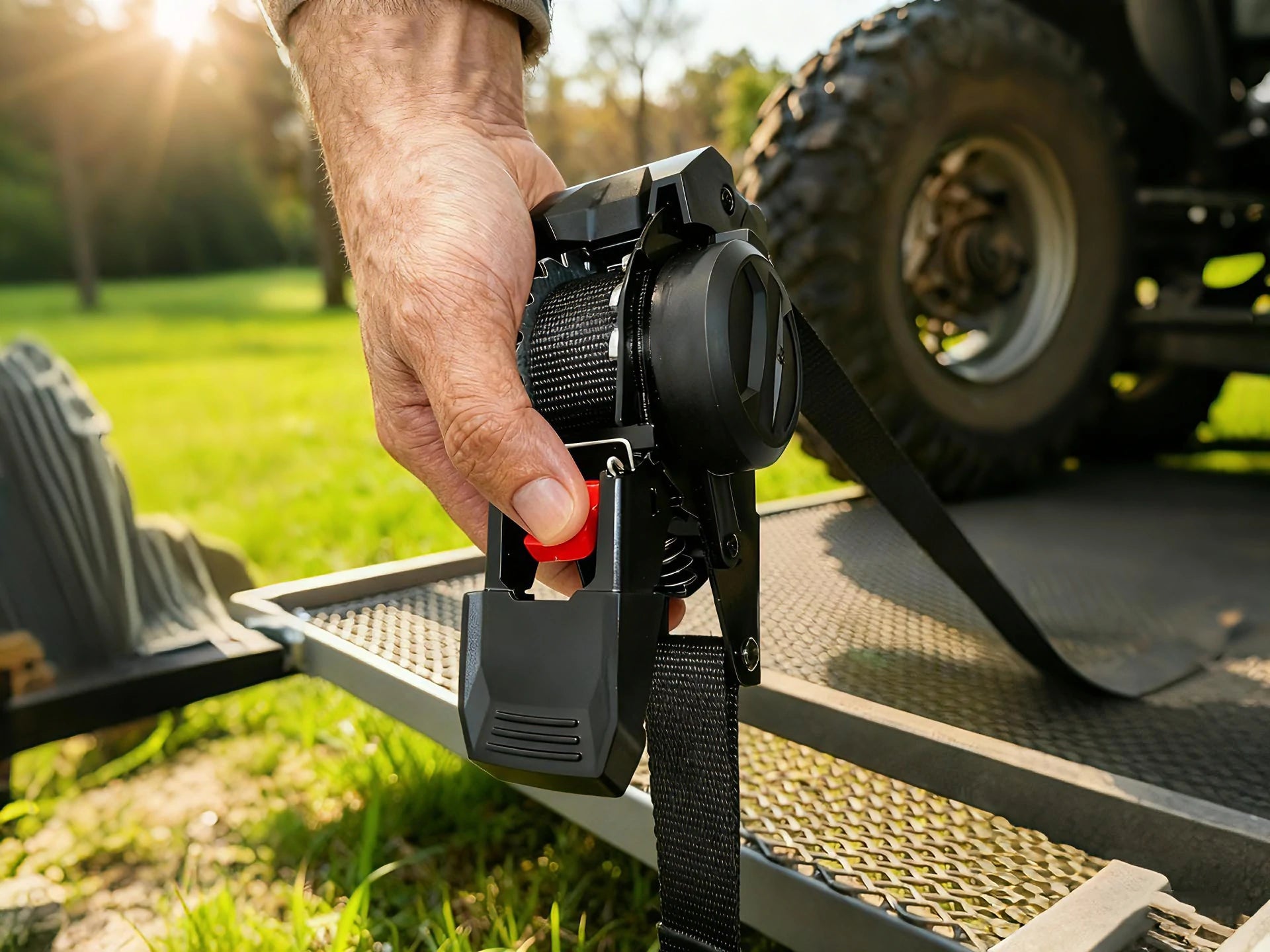 BOODAA Automatic retractable ratchet strap secures a small four-wheel off-road vehicle to a trailer